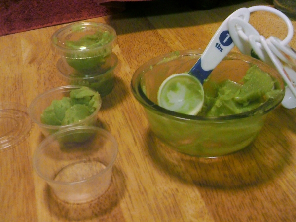 I often will make enough butter for several batches and then put enough for a batch, 1 fl oz, in separate portion cups and store in the freezer. Then, because each represents a batch, I'll take one and add it to the remainder of fresh butter called for in the recipe and stir it in well.